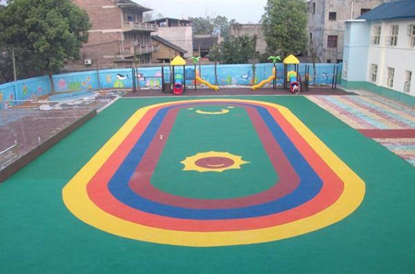 一般幼兒園EPDM地面以綠色為主,也有以藍(lán)色、紅色為主的。再在上面用不同的顏色鋪設(shè)太陽(yáng)、月亮、跳房子等圖案。