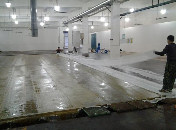 粘貼玻璃纖維布兩層:使用乙烯基地坪清漆:固化劑=100:1.2攪拌均勻后用于粘貼玻璃纖維布,要求粘貼的玻纖布平整,不起鼓,樹脂漆均勻,無氣泡等現(xiàn)象。