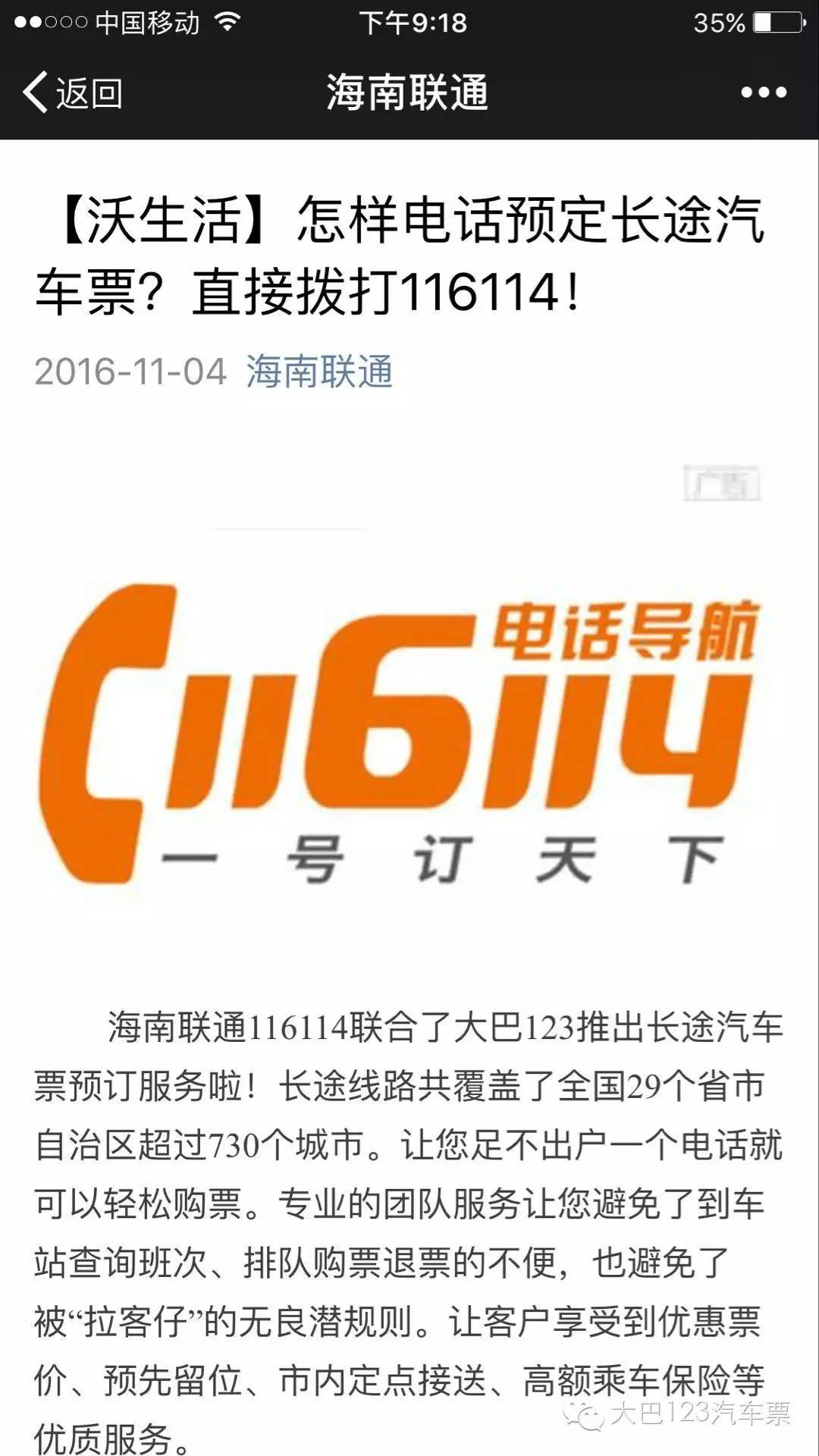 如今,大巴123汽車票與海南聯(lián)通116114合作了,不僅可以在微信上購買汽車票,也可以用電話預(yù)定汽車票。