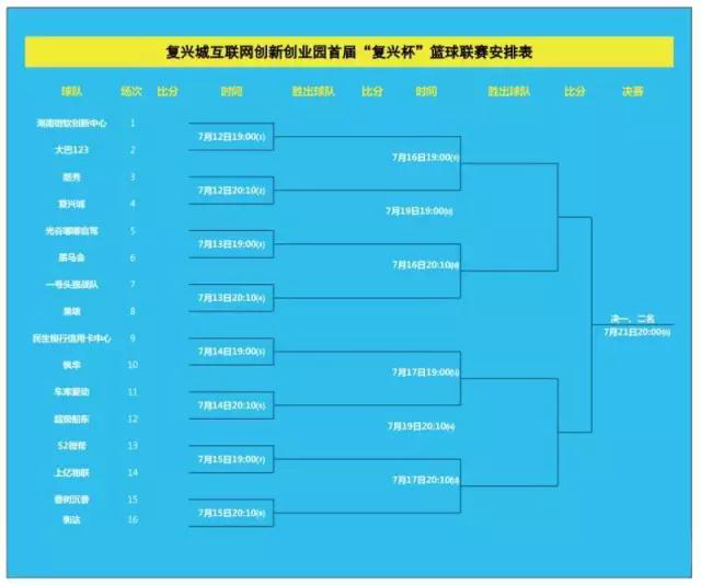 本次比賽首輪對(duì)陣為:海南微軟創(chuàng)新中心VS大巴123、酷秀VS復(fù)興城、光谷嘟嘟自駕VS黑馬會(huì)、一號(hào)頭狼戰(zhàn)隊(duì)VS果噥、民生銀行信用卡中心VS楓華、車庫愛動(dòng)聯(lián)隊(duì)VS超級(jí)船東、52微幫VS上億物聯(lián)、香樹沉香VS衡達(dá)。比賽采用單敗淘汰制,勝者進(jìn)入八強(qiáng),負(fù)者出局,直至決出所有名次。