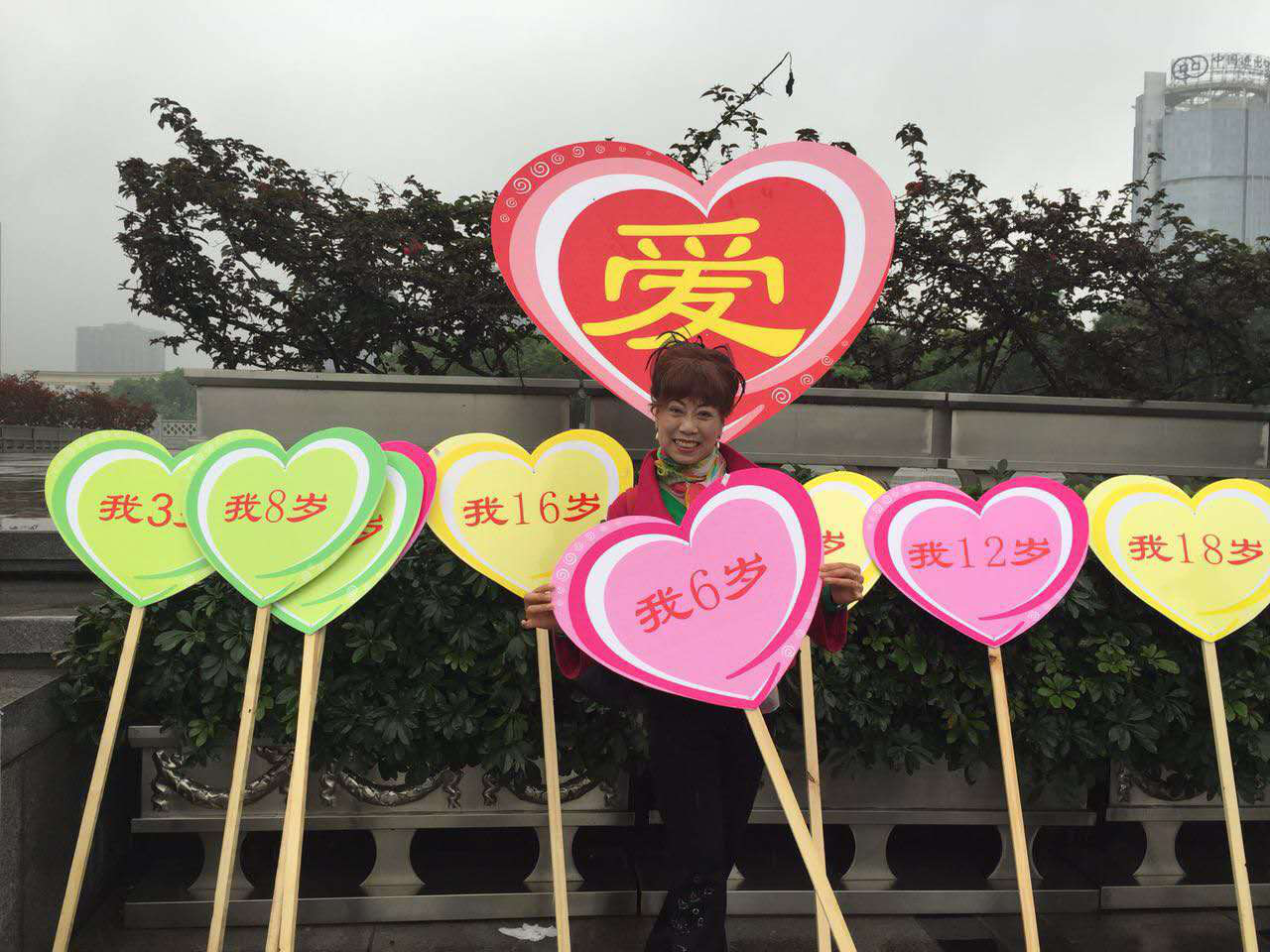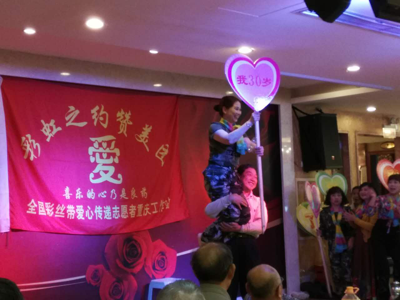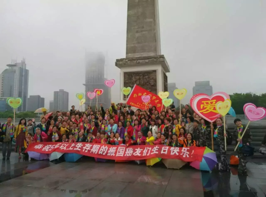 2016年4月10日,全國(guó)彩絲帶愛(ài)心傳遞重慶工作站的志愿者們?cè)趦山腋V場(chǎng)為重慶病友(5年以上癌齡)舉辦了一場(chǎng)特別的集體生日,百名癌癥患者齊唱《生日歌》,大呼“我們活了!”