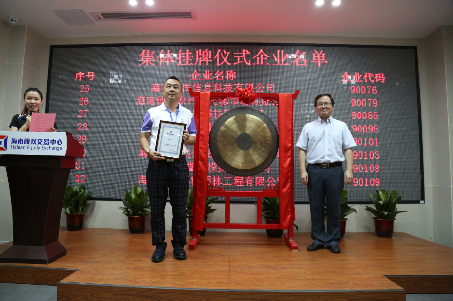 儀式現(xiàn)場,37家掛牌企業(yè)代表一一上臺鳴鑼并接受掛牌證書。海南中匯創(chuàng)業(yè)投資管理有限公司、海南維特律師事務(wù)所和海南信天源投資有限公司因在推薦企業(yè)掛牌股交中心方面的積極表現(xiàn)獲得了第二季度優(yōu)秀推薦機構(gòu)的表彰。