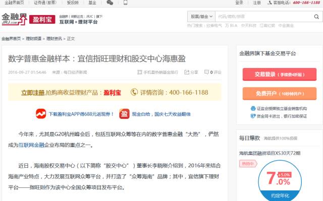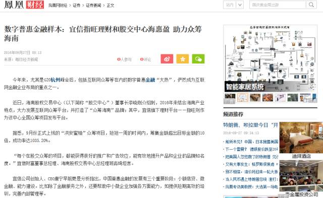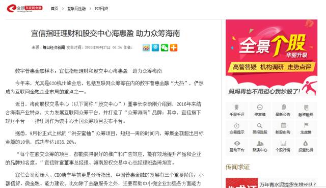 9月23日,海南股權(quán)交易中心在椰城??谂e辦“數(shù)字金融在海南暨互聯(lián)網(wǎng)+農(nóng)業(yè)研討會”,研討會上討論了多項重要議題,尤其是“眾籌海南”項目,受到了高度關(guān)注。國內(nèi)主流財經(jīng)媒體《每日經(jīng)濟新聞》以《數(shù)字普惠金融樣本:宜信指旺理財和股交中心?;萦Ρ娀I海南》對本次研討會做了重要報道,文章刊發(fā)后,被新浪、網(wǎng)易、金融界、鳳凰、全景網(wǎng)、同花順財經(jīng)等主流媒體網(wǎng)站轉(zhuǎn)載。