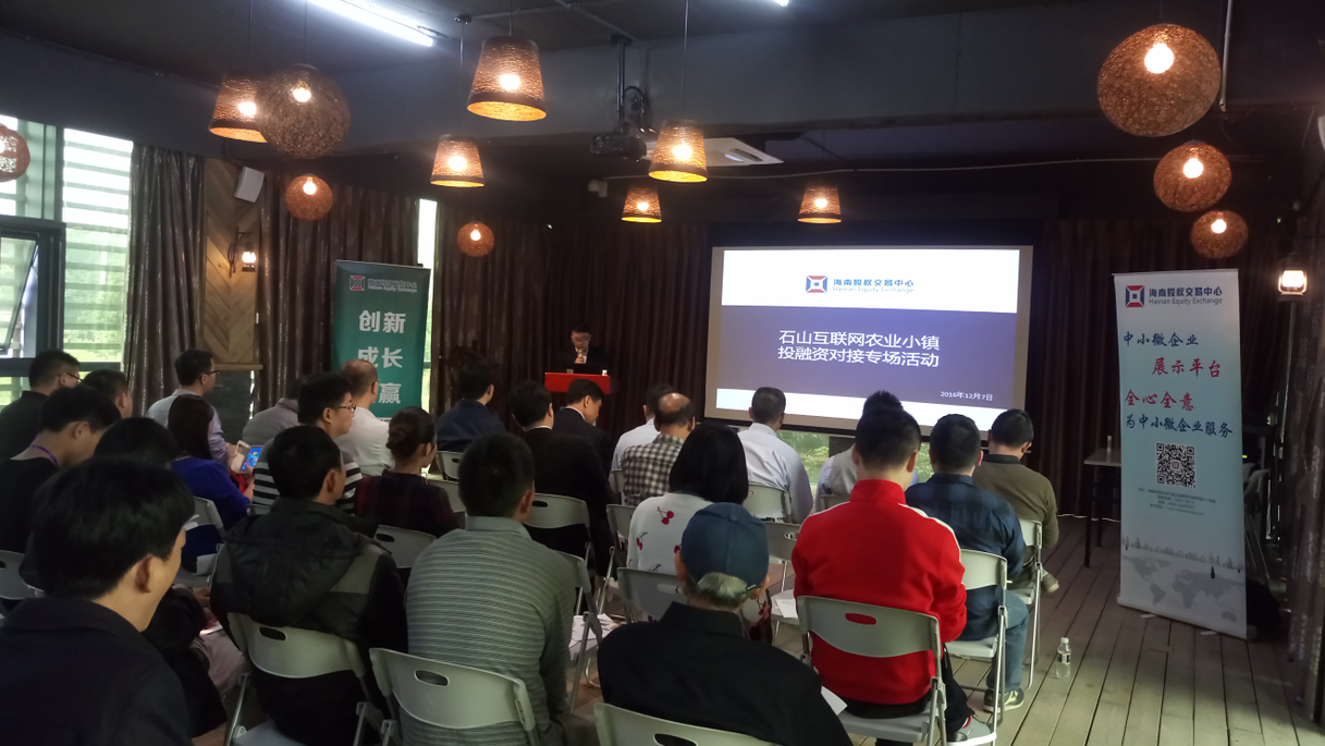 12月7日,石山互聯(lián)網(wǎng)農(nóng)業(yè)小鎮(zhèn)投融資對接專場活動在石山互聯(lián)網(wǎng)農(nóng)業(yè)小鎮(zhèn)運營中心成功舉行。此次對接會由石山鎮(zhèn)人民政府主辦,海南股權交易中心、石山互聯(lián)網(wǎng)農(nóng)業(yè)小鎮(zhèn)運營中心共同承辦。中共海口市秀英區(qū)委常委、石山鎮(zhèn)委書記胡余亨,??谑行阌^(qū)石山鎮(zhèn)人民政府副鎮(zhèn)長胡煒彬,海南股權交易中心副總裁許博、投資機構、石山鎮(zhèn)企業(yè)代表及合作社參加了本次活動。