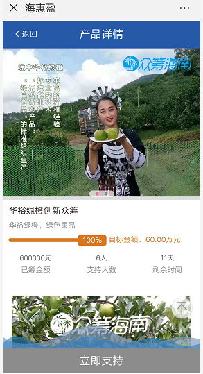 本單創(chuàng)新眾籌以綠橙為產(chǎn)品標(biāo)的,不同于海惠盈平臺其他實(shí)物眾籌的實(shí)物類的回報(bào)方案,此次綠橙眾籌項(xiàng)目提供“實(shí)物”和“代銷收益”兩種回報(bào)方案,產(chǎn)品存續(xù)期為14個(gè)月,即產(chǎn)品到期日是2020年1月份,認(rèn)籌用戶到期可根據(jù)認(rèn)籌時(shí)選擇的回報(bào)方案獲得相應(yīng)的回報(bào)。