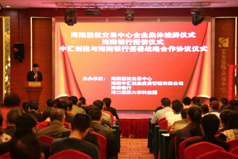1月15日,海南股權(quán)交易中心企業(yè)集體掛牌暨銀行授信簽約儀式,在??趯毎l(fā)幸福酒店舉行。本次活動由海南股權(quán)交易中心、海南中匯創(chuàng)業(yè)投資管理有限公司、海南銀行、??趪掖髮W科技園聯(lián)合主辦。37家企業(yè)現(xiàn)場集體掛牌海南股權(quán)交易中心,其中12家企業(yè)獲得海南銀行合計額度2100萬元的授信。