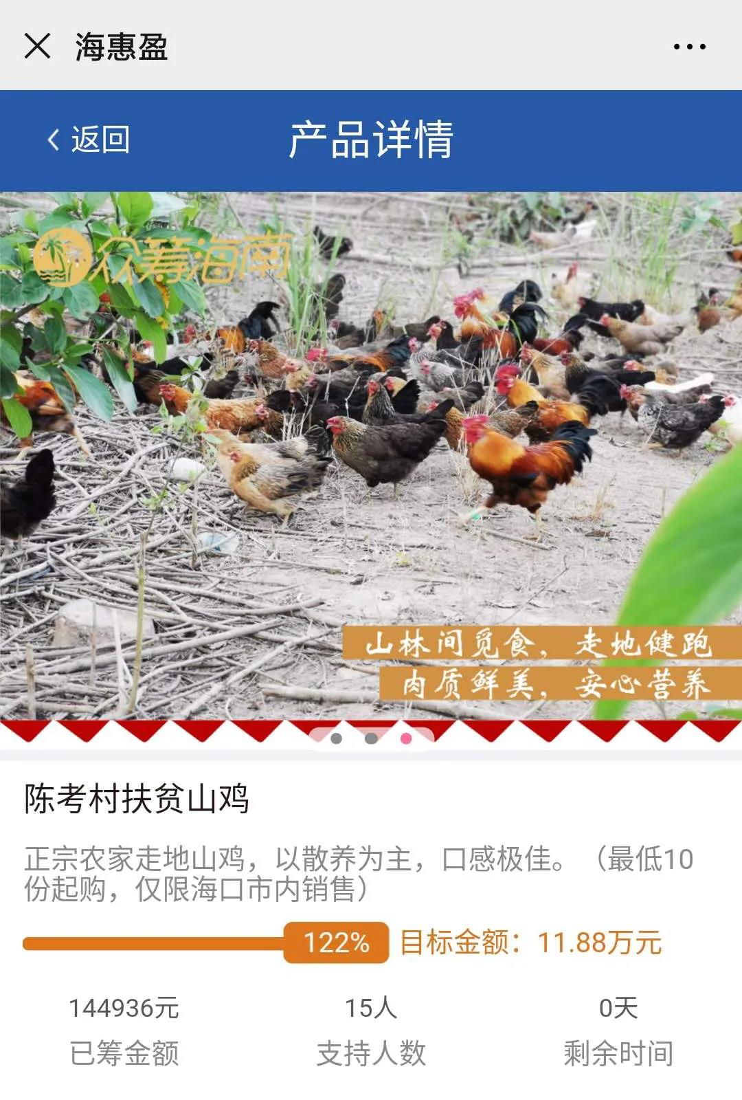 為了持續(xù)幫助海南省樂東縣大安鎮(zhèn)陳考村村民打開當?shù)貎?yōu)質(zhì)農(nóng)產(chǎn)品的銷路,在海南證監(jiān)局的指導下,海南股交借助“互聯(lián)網(wǎng)+農(nóng)業(yè)眾籌”的形式,再次幫助陳考村村民享受“互聯(lián)網(wǎng)+”的發(fā)展紅利。海南股交旗下綜合金融服務平臺“海惠盈”于4月7日推出“陳考村扶貧山雞”項目,開啟新一期的扶貧眾籌活動,截止4月27日,該項目完成率122%,眾籌金額14.4萬余元。