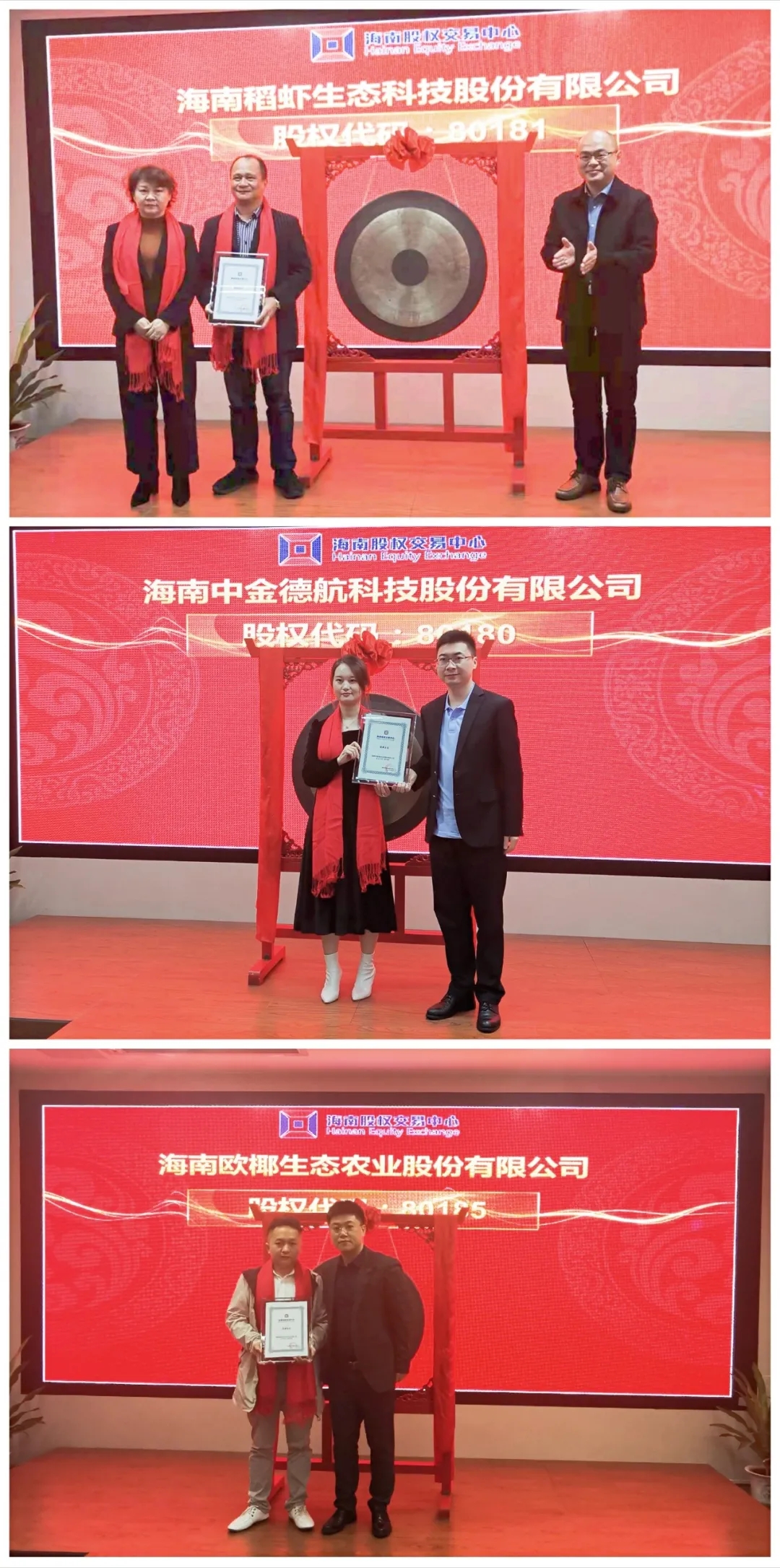 在企業(yè)集體掛牌儀式上,海南稻蝦生態(tài)科技股份有限公司、海南中金德航科技股份有限公司、海南歐椰生態(tài)農(nóng)業(yè)股份有限公司等3家優(yōu)質(zhì)企業(yè)敲響了掛牌的鑼聲,正式登陸海南股交交易板。海南股交作為多層次資本市場的重要一環(huán),將竭力為掛牌企業(yè)提供融資、規(guī)范、培育等多方面的服務(wù),為企業(yè)對接多層次資本市場打下堅(jiān)實(shí)的基礎(chǔ)。