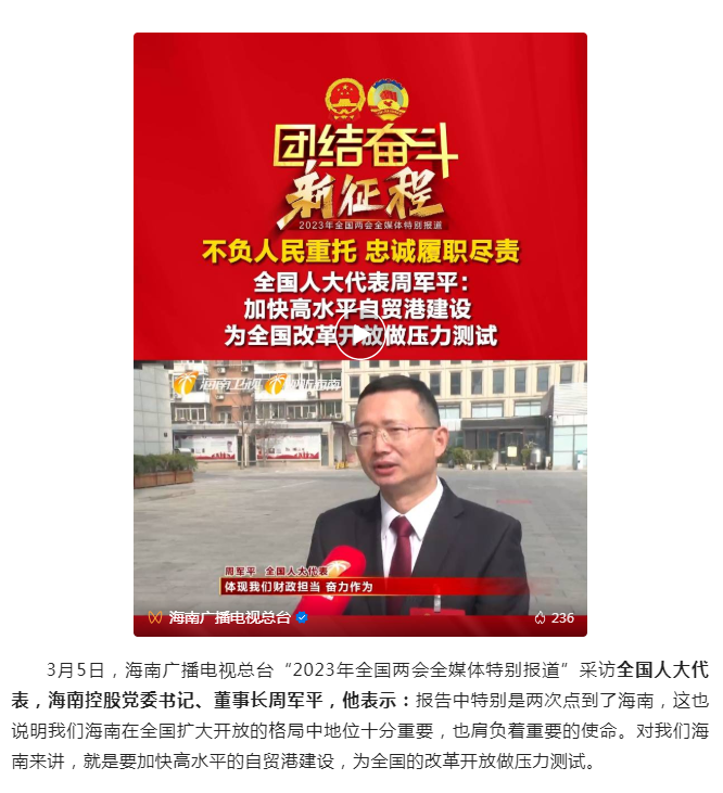 近日來,新華社、經(jīng)濟參考報、海南日報、海南廣播電視總臺等多家媒體,先后采訪了全國人大代表、海南控股黨委書記、董事長周軍平,他圍繞高水平推動海南自貿(mào)港建設(shè)、恢復(fù)和擴大消費、全島封關(guān)運作“一號工程”等主題談體會、話發(fā)展。