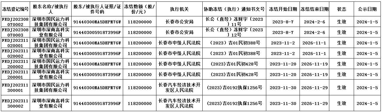 依據(jù)長春市公安局《協(xié)助凍結(jié)財(cái)產(chǎn)通知書》[長公(直經(jīng))凍財(cái)字〔2023〕11號)]、長春市人民法院《協(xié)助執(zhí)行通知書》[(2023)吉01民初388號]及長春汽車經(jīng)濟(jì)技術(shù)開發(fā)區(qū)人民法院[(2023)吉0192執(zhí)保1256號]等文件,我中心為??诼?lián)合農(nóng)村商業(yè)銀行股份有限公司(企業(yè)代碼:893529)股東深圳市國民運(yùn)力科技集團(tuán)有限公司、深圳市深商高科實(shí)業(yè)有限公司辦理股權(quán)凍結(jié)/股權(quán)輪候凍結(jié)登記,具體情況如下: