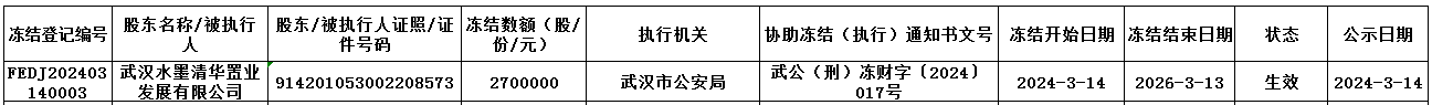 依據(jù)武漢市公安局《協(xié)助凍結(jié)財產(chǎn)通知書》[武公(刑)凍財字〔2024〕017號]文件,我中心為海南瓊中長江村鎮(zhèn)銀行股份有限公司(企業(yè)代碼:893525)股東武漢水墨清華置業(yè)發(fā)展有限公司辦理股權凍結(jié)登記,具體情況如下: