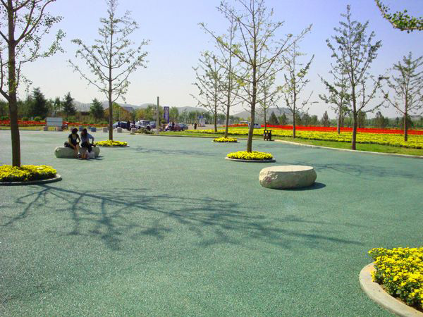 彩色透水地坪是采用專用骨料、透水混凝土增強(qiáng)劑、水泥和水拌制而成的一種多孔輕質(zhì)混凝土,它不含細(xì)骨料, 由粗骨料表面包覆一薄層水泥漿相互粘結(jié)而形成孔穴均勻分布的蜂窩狀結(jié)構(gòu), 故具有透氣、透水和重量輕的特點(diǎn),也可稱無(wú)砂透水混凝土,待凝固后表面用專用噴涂機(jī)噴涂丙烯酸樹脂罩面劑,增加表面色彩、光澤度、亮度、耐磨度。具有比傳統(tǒng)透水地坪更高的強(qiáng)度和耐久度,能滿足結(jié)構(gòu)物力學(xué)性能,使用功能以及使用年限的要求,具有與自然環(huán)境的協(xié)調(diào)性,減輕對(duì)地球的生態(tài)環(huán)境的負(fù)荷,實(shí)現(xiàn)非再生資源可循環(huán)性使用,具有良好的使用功能,能為人類構(gòu)筑溫和,舒適,便捷的生活環(huán)境。